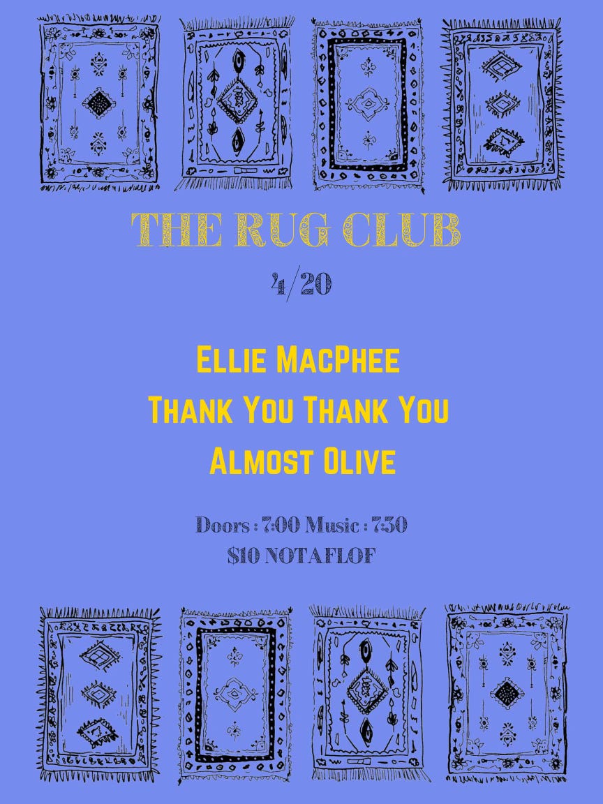 I’ve got a set coming up in Philly on April 20th. It’s a house show in West (they call the spot Rug Club) and I’ll be playing pretty much only new or unreleased songs. I hope you’ll come! Hit me up for more information.